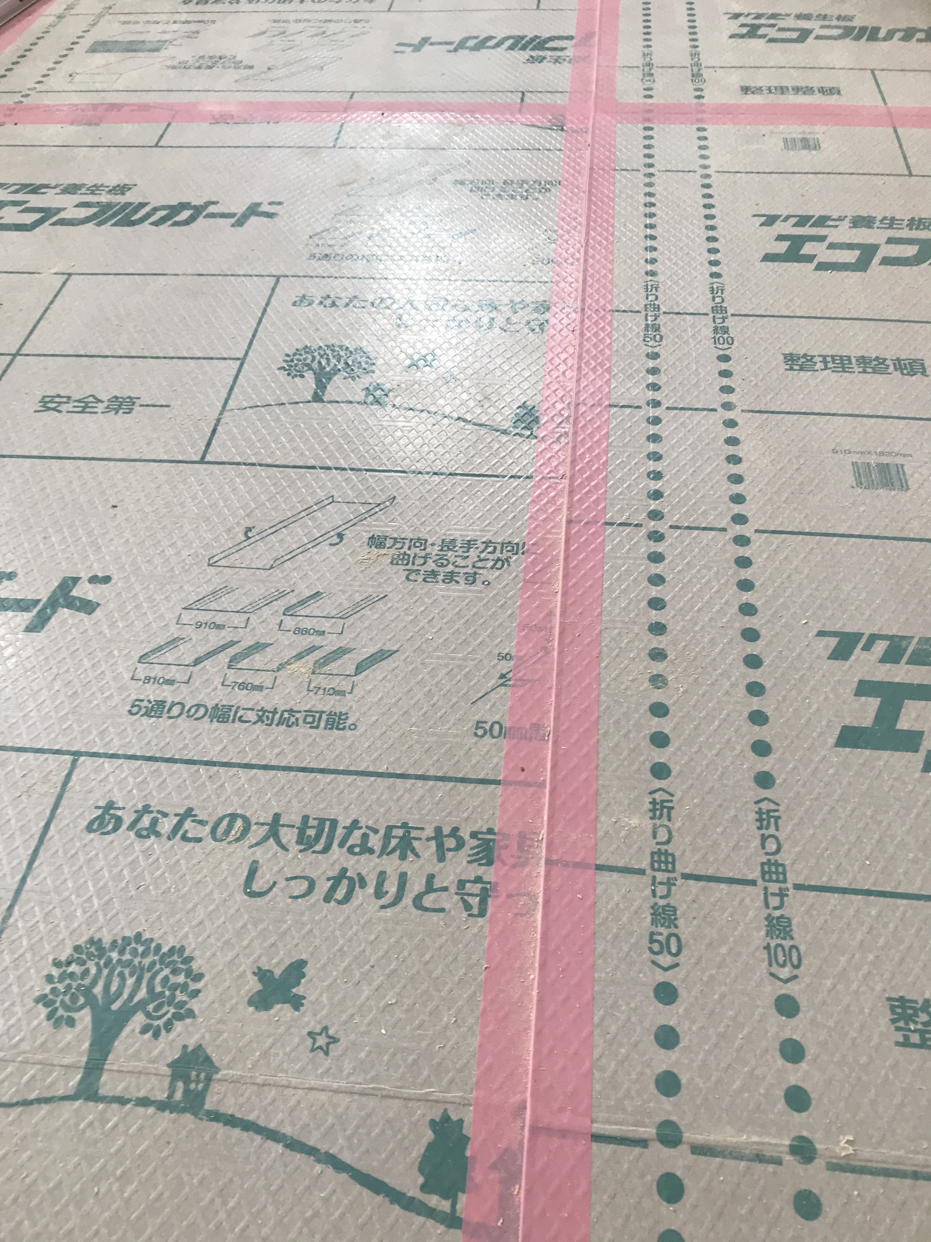 フロアーを貼り終わったら傷が付かないように壁の仕上がりまで養生を貼ります。