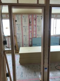 その後、壁に断熱材を入れていきます。これは外部からの熱の遮断と内部の熱の放熱(暖房やクーラーなど)を防ぐものです。